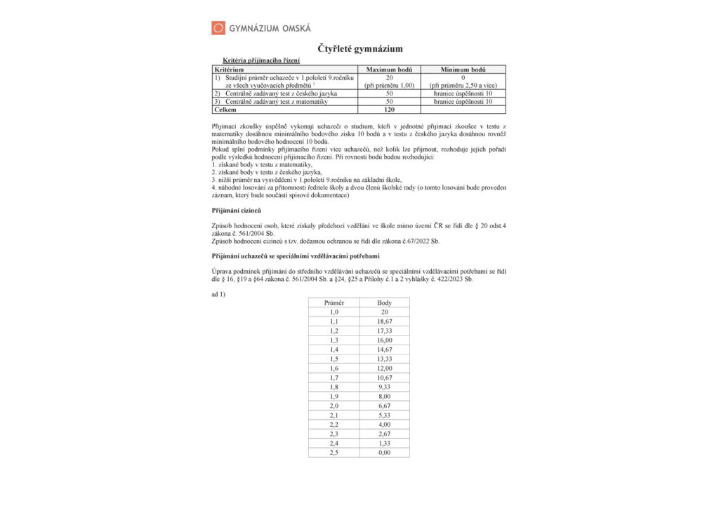 Podrobná kriteria přijetí: čtyřleté gymnázium, osmileté gymnázium